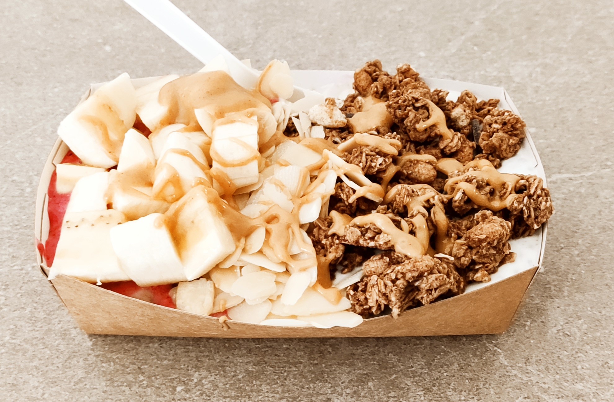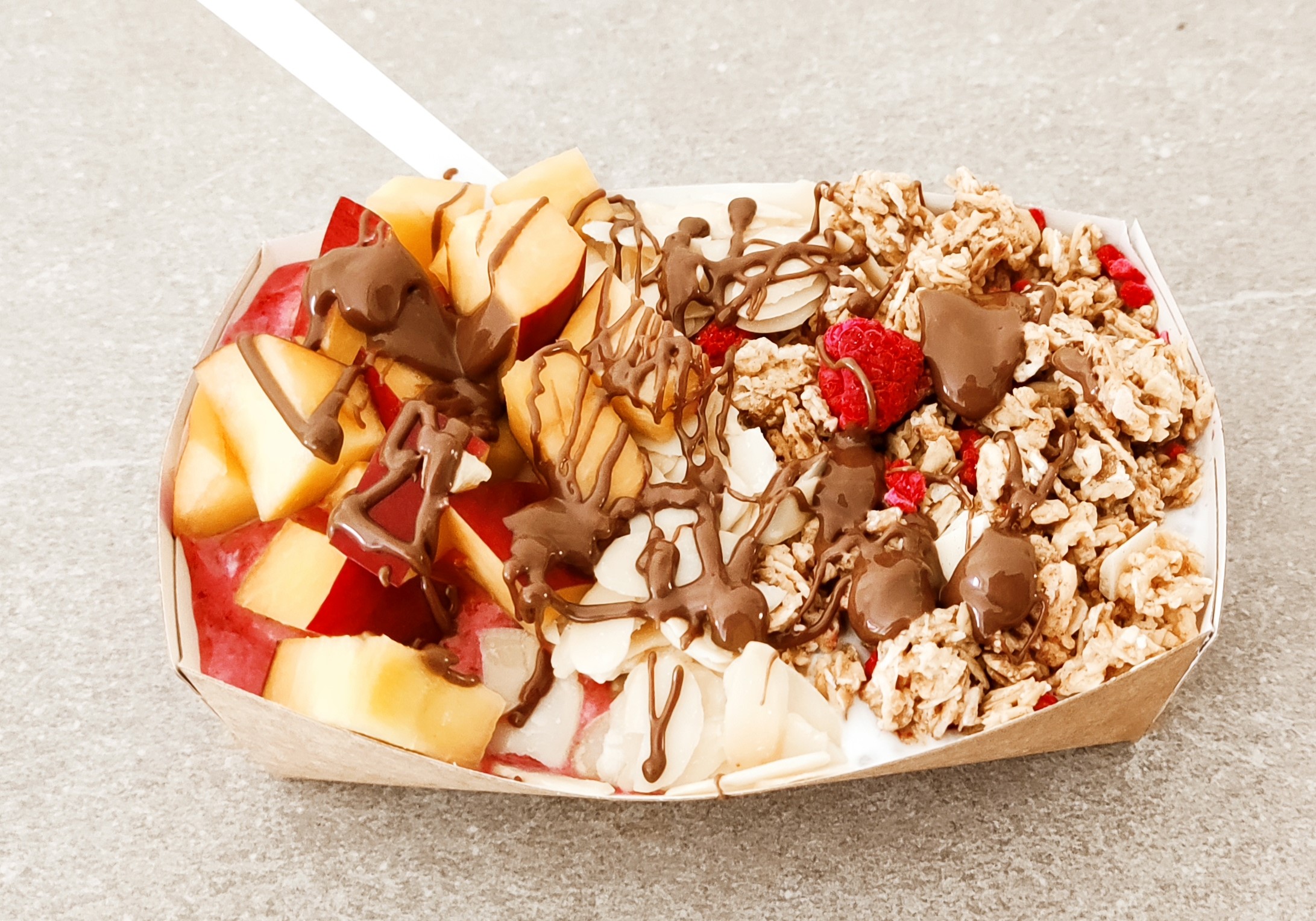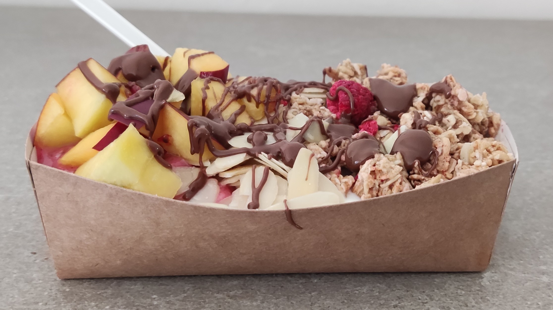 - Blended smoothie made from acai powder, frozen berries, coconut joghurt, some fruit and sugar